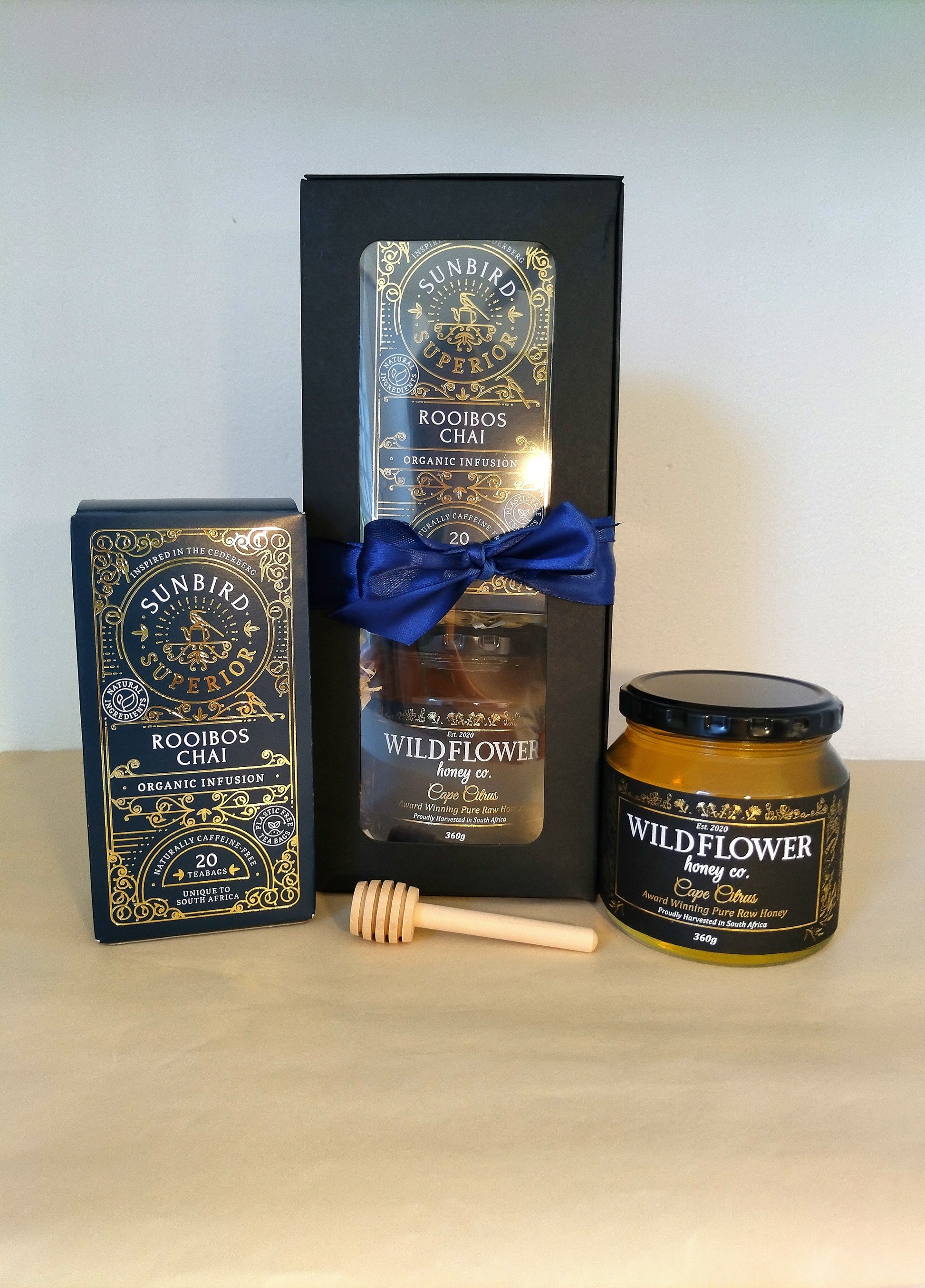 Here's a perfect 'warm' gift for Mom or Dad. Our award winning Cape Citrus honey paired with our favorite Sunbird Rooibos/Chai tea. Also comes with a wooden honey dipper.